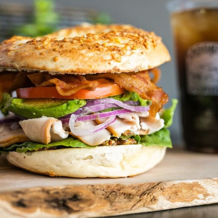 turkey, bacon, avocado, tomatoes, red onions, lettuce, and Dijon mustard